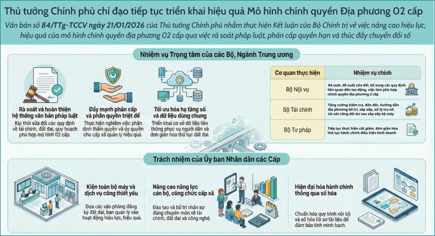 Vừa qua, Thủ tướng Chính phủ ban hành công văn số 84/TTg-TCCV ngày 21/01/2026 về tiếp tục triển khai hiệu quả mô hình chính quyền địa phương 2 cấp, nhằm hoàn thiện tổ chức bộ máy, nâng cao hiệu lực, hiệu quả quản lý nhà nước ở địa phương, đáp ứng yêu cầu phát triển trong giai đoạn mới. Theo đó, các bộ, ngành Trung ương tập trung rà soát, sửa đổi, bổ sung, ban hành mới hoặc bãi bỏ các văn bản quy phạm pháp luật không còn phù hợp với mô hình chính quyền địa phương 02 cấp; thực hiện nghiêm việc phân cấp, phân quyền, phân định rõ thẩm quyền giữa các cấp chính quyền, gắn với đẩy mạnh cải cách thủ tục hành chính, chuyển đổi số và nâng cao chất lượng cung ứng dịch vụ công. Việc rà soát tập trung vào các lĩnh vực trọng tâm như tài chính – ngân sách, đất đai, quy hoạch, tổ chức bộ máy, cán bộ, khoa học – công nghệ, giáo dục và đào tạo. Đối với Ủy ban nhân dân các tỉnh, thành phố trực thuộc Trung ương, Thủ tướng Chính phủ yêu cầu tập trung thực hiện nghiêm túc 04 nhóm nhiệm vụ trọng tâm sau: Tổ chức quán triệt và triển khai nghiêm Kết luận số 228-KL/TW và các chỉ đạo của Trung ương, Chính phủ, Thủ tướng Chính phủ về vận hành mô hình chính quyền địa phương 02 cấp. Khẩn trương đưa các tổ chức, đơn vị chuyên môn như khuyến nông, văn phòng đăng ký đất đai, ban quản lý vào hoạt động hiệu lực, hiệu quả, bảo đảm cung ứng đầy đủ dịch vụ công thiết yếu cho người dân và doanh nghiệp. Tăng cường đào tạo, bồi dưỡng, bố trí cán bộ, công chức cấp xã đúng chuyên môn, nhất là trong các lĩnh vực tài chính, đất đai, quy hoạch, công nghệ thông tin; đơn giản hóa quy trình nội bộ, đẩy mạnh ứng dụng công nghệ thông tin và chuyển đổi số. Hoàn thiện hạ tầng số, nền tảng số và cơ sở dữ liệu; chuẩn hóa quy trình công việc; đẩy mạnh cải cách thủ tục hành chính, bảo đảm giải quyết công việc nhanh, công khai, minh bạch; tiếp tục số hóa hồ sơ, tài liệu phục vụ vận hành mô hình chính quyền địa phương 02 cấp. Việc tiếp tục triển khai hiệu quả mô hình chính quyền địa phương 02 cấp theo Công văn số 84/TTg-TCCV của Thủ tướng Chính phủ có ý nghĩa rất quan trọng trong việc xây dựng nền hành chính nhà nước tinh gọn, hiện đại, hoạt động hiệu lực, hiệu quả, góp phần phục vụ tốt hơn quyền và lợi ích hợp pháp của người dân, doanh nghiệp trên địa bàn tỉnh Lâm Đồng./. Đinh Trúc - PBGDPL