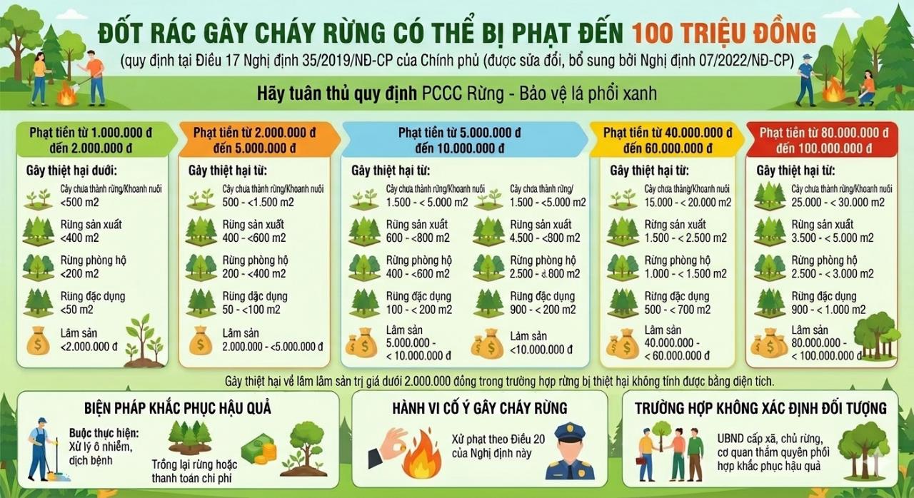 Trong thực tế, đôi khi vì chủ quan chỉ một hành vi tưởng như đơn giản như đốt rác gần rừng nhưng nếu không kiểm soát tốt, gây cháy rừng thì hậu quả không chỉ là thiệt hại tài nguyên thiên nhiên mà người vi phạm còn phải đối mặt với mức phạt hành chính lên đến 100 triệu đồng.