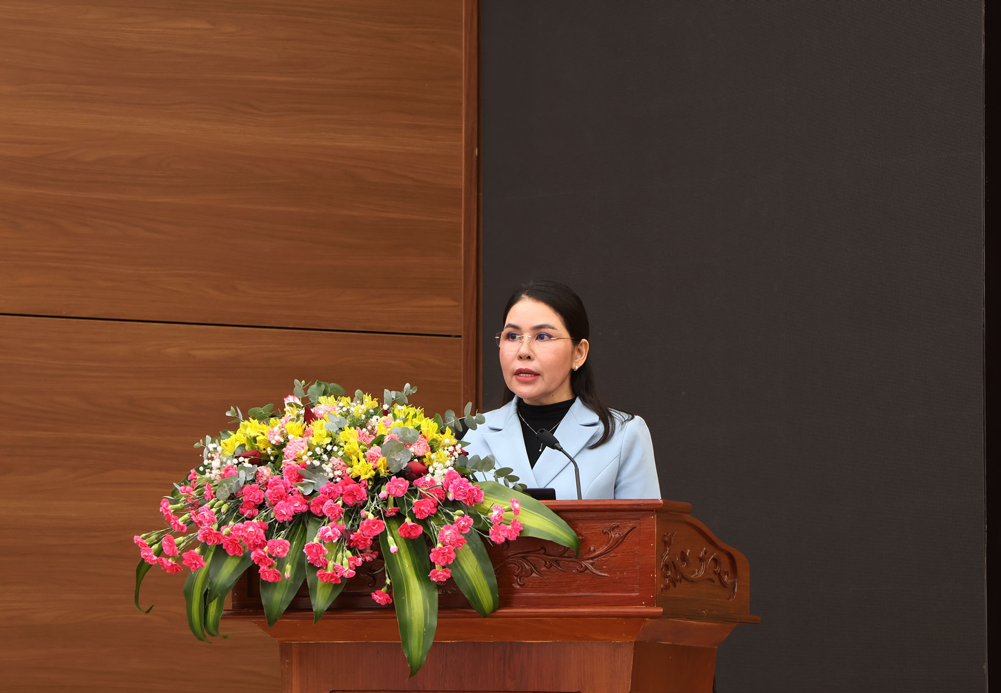 Bà Phạm Thị Minh Hiếu - Phó Chủ tịch Hội đồng Phối hợp phổ biến giáo dục pháp luật tỉnh, Phó Giám đốc Sở Tư pháp phát biểu tại Hội nghị