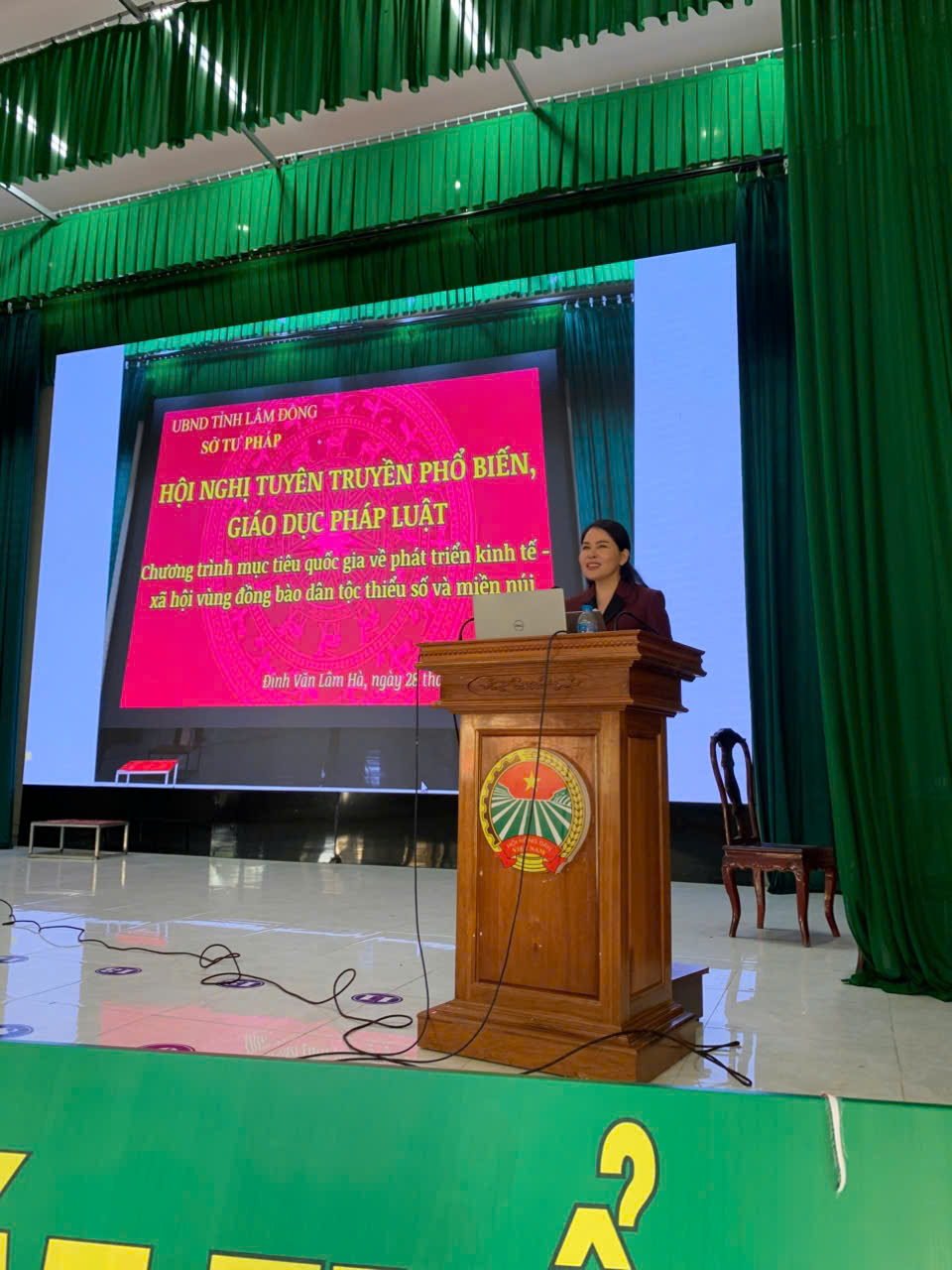 các chức sắc, chức việc tôn giáo, cán bộ cơ sở và người dân ở cơ sở tại xã Lạc Dương và xã Đinh Văn Lâm Hà, tỉnh Lâm Đồng, với các nội dung tuyên truyền pháp luật thiết thực, gần gũi với đời sống người dân như: Tuyên truyền, phổ biến nội dung chính sách, pháp luật về: hôn nhân và gia đình; phòng, chống bạo lực gia đình; tảo hôn và hôn nhân cận huyết thống; cảnh giác với các hình thức lừa đảo trực tuyến; Tuyên truyền, phổ biến nội dung chính sách, pháp luật về: xử lý vi phạm hành chính, đất đai; các quyền cơ bản đối với tài sản; Luật Bình đẳng giới; các chính sách dân tộc và kết quả thực hiện chính sách dân tộc, đại đoàn kết các dân tộc của Đảng và Nhà nước; về kỹ năng thực hiện trợ giúp pháp lý cho người dân tộc thiểu số, tiếp cận trợ giúp pháp lý đối với đồng bào vùng dân tộc thiểu số và miền núi.