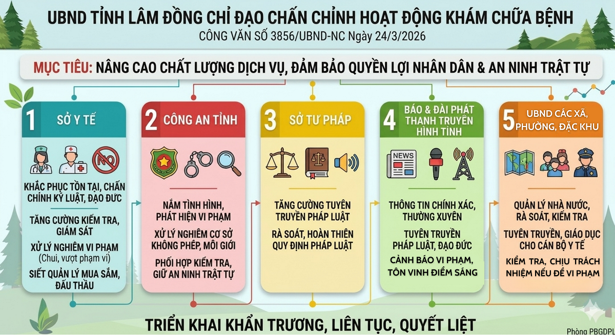 plus-circle Created with Sketch Beta. Aa Tuyên truyền phổ biến pháp luậtTin tức - Sự kiện Ủy ban nhân dân tỉnh Lâm Đồng chỉ đạo chấn chỉnh hoạt động khám chữa bệnh 25/03/2026 16:50 |   45 Your browser does not support the audio element.